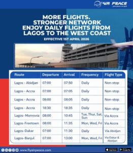 In addition, Air Peace will strengthen its presence on the Lagos–Accra–Monrovia route, operating flights four times weekly on Tuesdays, Thursdays, Saturdays, and Sundays.